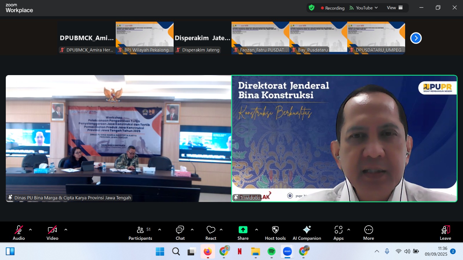 Workshop Pelaksanaan Pengawasan Tertib Penyelenggaraan dan Tertib Pemanfaatan Produk Konstruksi Provinsi Jawa Tengah Tahun 2025 ini dilaksanakan pada Selasa (9/9/2025) secara hybrid dan menghadirkan narasumber dari Direktorat Kompetensi dan Sumber Daya Konstruksi, Direktorat Jenderal Bina Konstruksi, Kementerian PUPR yaitu Wahyu Triwidodo, S.T., M.Eng. Acara ini dibuka langsung oleh oleh Kepala Dinas PU Bina Marga dan Cipta Karya Prov. Jawa Tengah, Dr. Ir. AR Hanung Triyono, M.Si. Beliau menyampaikan harapannya bahwa dengan adanya pengawasan tertib penyelenggaraan dan tertib pemanfaatan produk konstruksi ini dapat meningkatkan kualitas penyelenggaraan jasa konstruksi di Jawa Tengah. (bjk-amr)